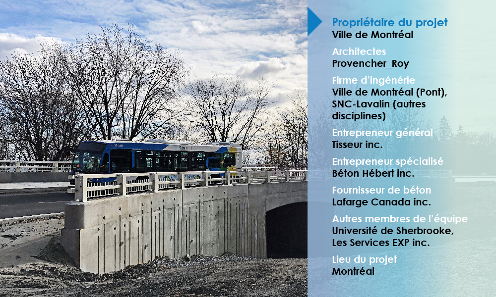 L’entrepreneur a relevé le défi audacieux de fabriquer les coffrages courbés et des motifs architecturaux arrondis. Des murs de soutènement à géométrie complexe en béton préfabriqué sont prévus entre les ponts afin de créer des paliers de plantation végétalisés. La totalité des éléments des ponts (à l’exception des semelles) est armée de barre en acier inoxydable (S32304) afin de prolonger considérablement la durée de vie de l’ouvrage; une première au Québec. La durée de vie nominale des ponts est de 125 ans principalement dû à ces barres. Par conséquent, le coût du cycle de vie ainsi que l’empreinte environnementale seront réduits.